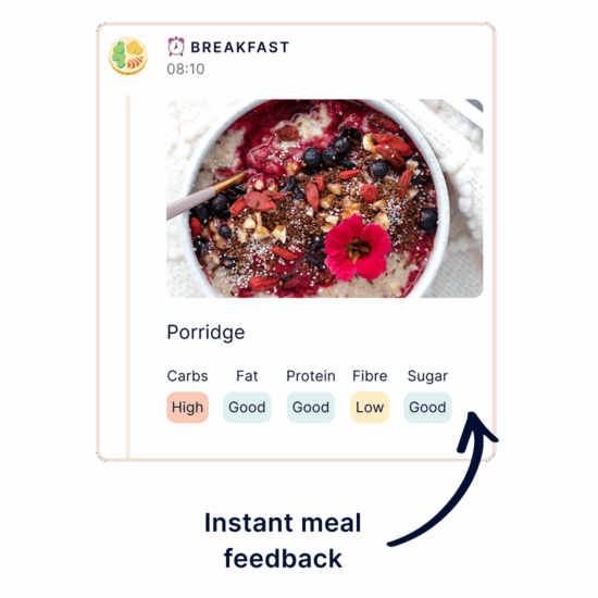 After logging a meal or snack, you’ll receive feedback in the “Logs” section. This feedback helps you understand if your meal or snack was too low, in the optimal range, or too high in terms of carbs, protein, fats, fiber, and sugar. Use this feedback as a reflection tool to see what you can improve for next time.