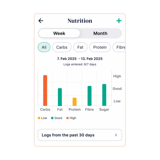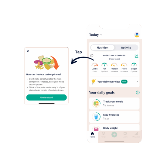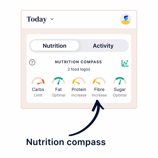 At the top of your home screen, you’ll find an overview of your daily nutritional intake. The nutrition compass provides guidance to help you adjust your upcoming meals or snacks. Your goal is to achieve an ideal balance of carbs, protein, fats, fibre, and sugar by the end of the day.