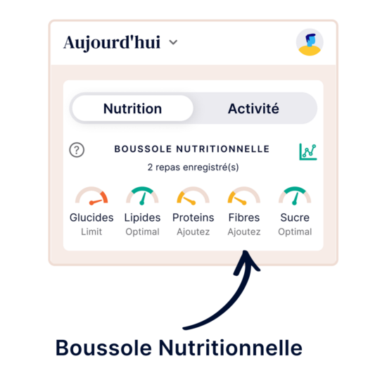 En haut de votre écran d’accueil, vous trouverez un aperçu de votre apport nutritionnel quotidien. La boussole nutritionnelle vous guide pour vous aider à ajuster vos prochains repas ou snacks. Votre objectif est d’atteindre un équilibre idéal entre glucides, protéines, lipides, fibres et sucres en fin de journée.