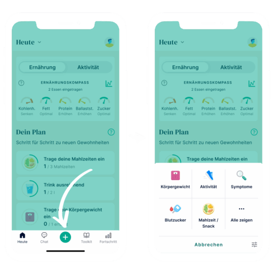 Es können einige unterschiedliche Themen mit der Oviva Direkt App protokolliert werden, wie „Mahlzeit / Snack“, „Körpergewicht“, „Aktivität“, „Stimmung“ und weitere (siehe unten). Sie können sich Ihre Einträge auf dem Bildschirm „Home“ und auf dem Bildschirm „Fortschritt“ ansehen, um Trends, Muster und Fortschritte zu sehen.