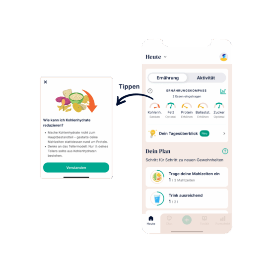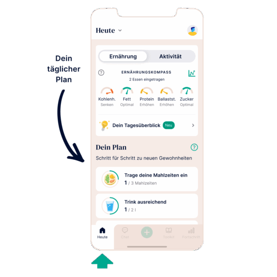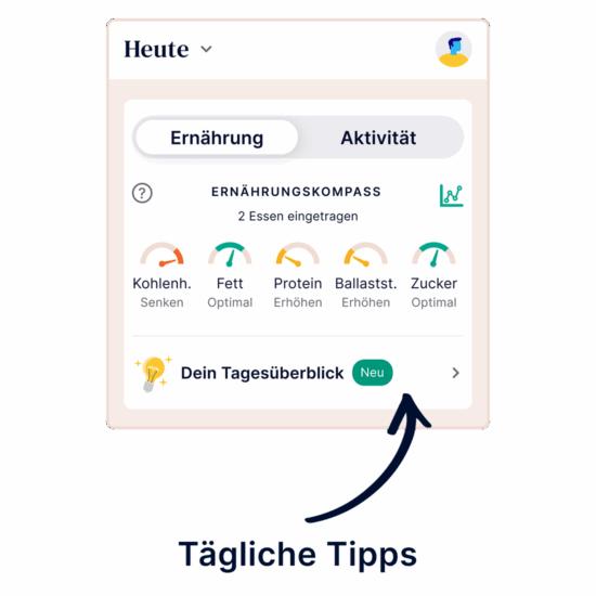 Am Morgen finden Sie in den täglichen Tipps eine Zusammenfassung Ihrer gestrigen Einträge. Sie erfahren, was gestern gut lief und was Sie heute verbessern können, um Ihre Ernährung zu optimieren. Dazu erhalten Sie konkrete Empfehlungen, die Sie im Laufe des Tages umsetzen können!