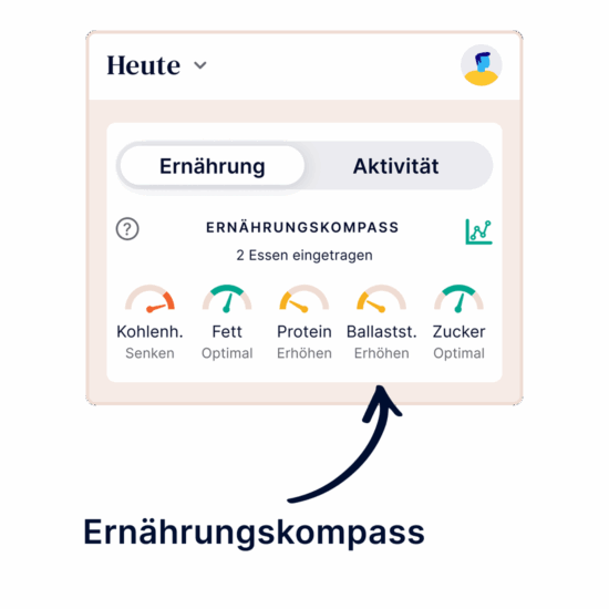 Am oberen Rand des Startbildschirms erhalten Sie eine Übersicht über Ihre tägliche Nährstoffzufuhr. Der Ernährungskompass gibt Ihnen eine Richtung an, damit Sie Ihre nächsten Mahlzeiten oder Snacks anpassen können. Ziel ist es, am Ende des Tages eine ideale Balance zwischen Kohlenhydraten, Eiweiß, Fetten, Ballaststoffen und Zucker zu erreichen. Sobald Sie eine Mahlzeit im Foto-Ess-Tagebuch eintragen, aktualisiert sich der Kompass automatisch. So sehen Sie auf einen Blick, welche Nährstoffe Sie senken oder erhöhen sollten, und wo Sie im Optimalbereich sind.