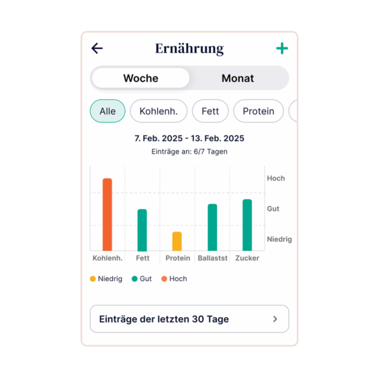 Im Bereich „Fortschritt“ bekommst du unter Ernährungstrends einen klaren Überblick über deine langfristige Ernährung. Du kannst wählen, ob du dir die Trends der letzten 7 oder 30 Tage anzeigen lassen möchtest.