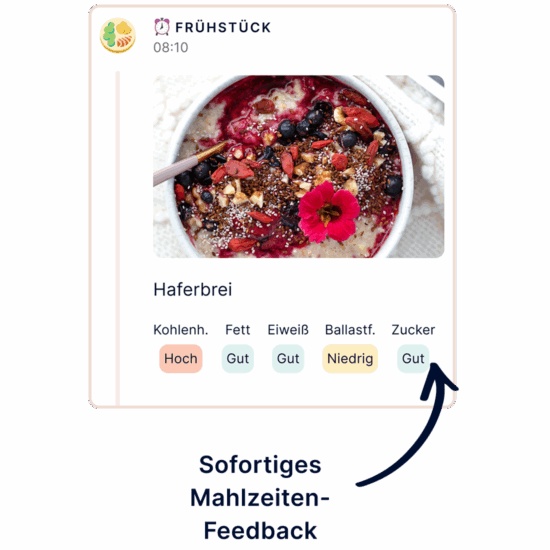 Nachdem Sie eine Mahlzeit oder einen Snack protokolliert haben, wird Ihnen im Abschnitt „Einträge“ Feedback zu Ihrer Mahlzeit angezeigt. Dieses Feedback hilft Ihnen zu verstehen, ob Ihre Mahlzeit oder Ihr Snack insgesamt zu niedrig, im guten Bereich oder zu hoch in Bezug auf Kohlenhydrate, Eiweiß, Fette, Ballaststoffe und Zucker ist. Sie können dieses Feedback als Reflexionsinstrument verwenden, um zu erkennen, was Sie beim nächsten Mal verbessern können.