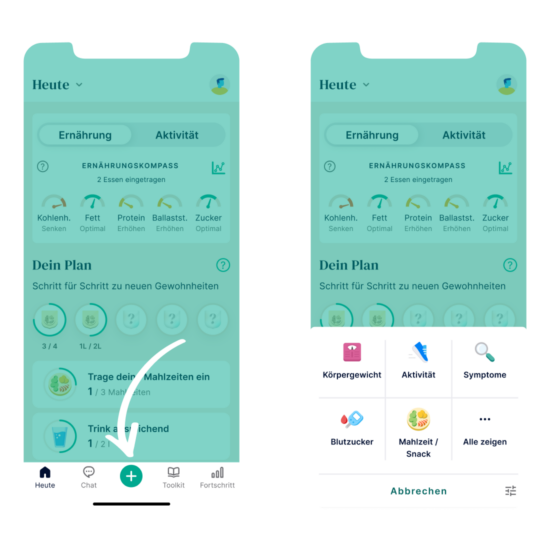 Es können einige unterschiedliche Themen mit der Oviva Direkt App protokolliert werden, wie „Mahlzeit / Snack“, „Körpergewicht“, „Aktivität“, „Stimmung“ und weitere (siehe unten). Du kannst dir deine Einträge auf dem Bildschirm „Heute“ und auf dem Bildschirm „Fortschritt“ ansehen, um Trends, Muster und Fortschritte zu sehen.