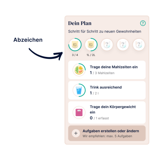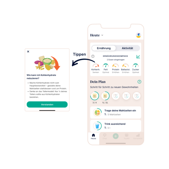 - Die von der App bereitgestellten Ernährungsvorschläge basieren auf einem Algorithmus. Der Algorithmus berücksichtigt deine wichtigsten Ernährungspräferenzen, z. B. vegan oder vegetarisch, aber möglicherweise nicht mögliche Unverträglichkeiten oder Allergien. Wende dich im Zweifelsfall immer zuerst an deinen medizinischen Betreuer.