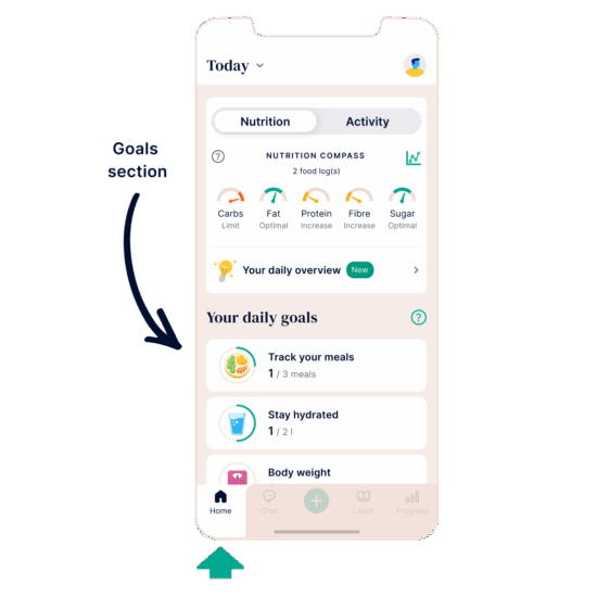 At the top of your home screen, you’ll find an overview of your daily nutritional intake. The nutrition compass provides guidance to help you adjust your upcoming meals or snacks. Your goal is to achieve an ideal balance of carbs, protein, fats, fibre, and sugar by the end of the day.