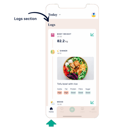 After logging a meal or snack, you’ll receive feedback in the “Logs” section. This feedback helps you understand if your meal or snack was too low, in the optimal range, or too high in terms of carbs, protein, fats, fiber, and sugar. Use this feedback as a reflection tool to see what you can improve for next time.