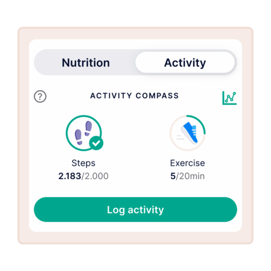 Access the Activity Compass using the toggle at the top of your Home tab. The Activity Compass gives you a simple, visual overview of your daily activity – showing your steps and exercise minutes in one place. It automatically adjusts your personalised targets to help you stay consistent and build healthy routines. Your targets are personalised and adaptive, based on: